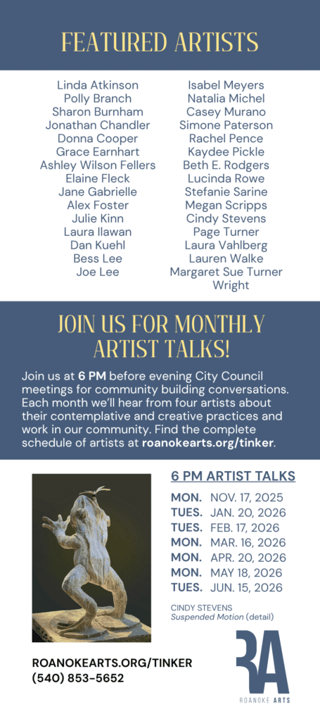 In continuing work begun in 2022 with the “Year of the Artist,” Roanoke’s creative residence will model the way for all of us. With the resulting exhibition, subsequent use of the work and the statements of artists, they will invite us to all pause, observe, breathe, and appreciate our natural world.