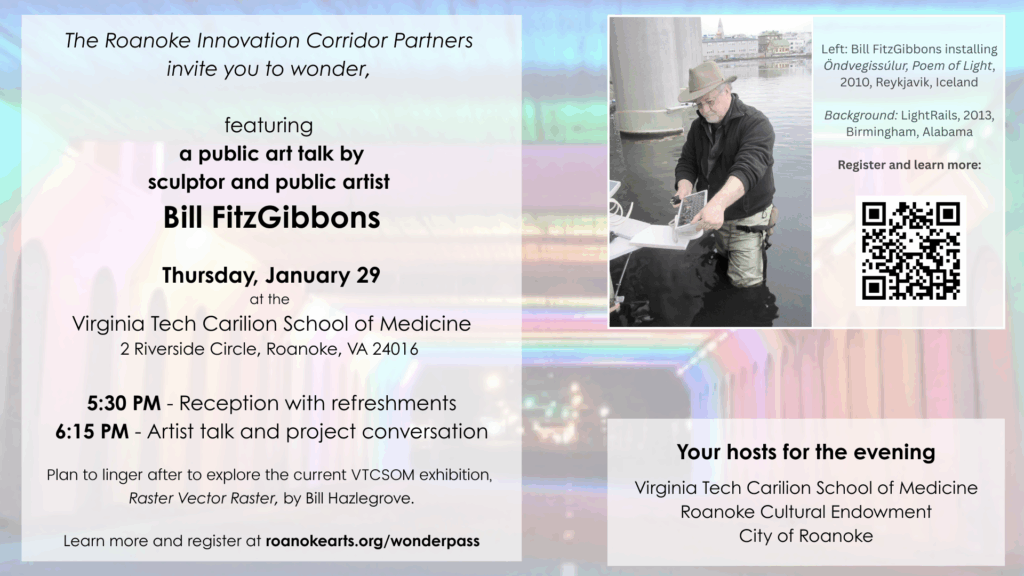 The event is being held in relation to a potential public art installation on Roanoke’s Innovation Corridor. Please come and take part in the initial conversation that may lead to a transformative project for our community. The interactive session will also also include an opportunity to help advance the public art component of the City’s emerging Arts and Cultural Plan. Register below.